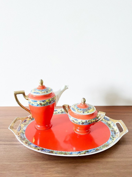 Servizio da tè rosso/arancio brillante composto da vassoio, piccola teiera e zuccheriera.
