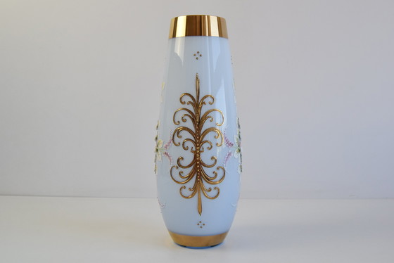Uno squisito vaso antico in porcellana, splendidamente dipinto a mano con delicati motivi floreali e decorato con intricate volute dorate. La delicata smaltatura blu pastello fa da sfondo sereno ai vivaci fiori e agli elaborati decori dorati. Sia il bordo che la base sono rifiniti in oro intenso, aggiungendo un tocco di lusso e raffinatezza. Questo pezzo proviene probabilmente dall'Europa centrale, forse dalla Boemia o dall'Austria, ed è uno splendido esempio di porcellana decorativa di inizio XX secolo.
