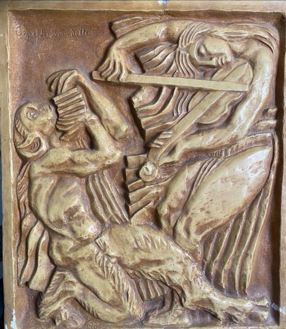 antoine bourdelle. scultura in gesso o simile con misure di 46,5 x 40 cm. lievi danni. davanti al nome bourdelle c'è qualcosa di scritto, non lo sappiamo ed è la firma dell'autore o della bottega o semplicemente una dedica. datata 1908. spessore 3,5 cm. titolo dell'opera la musique