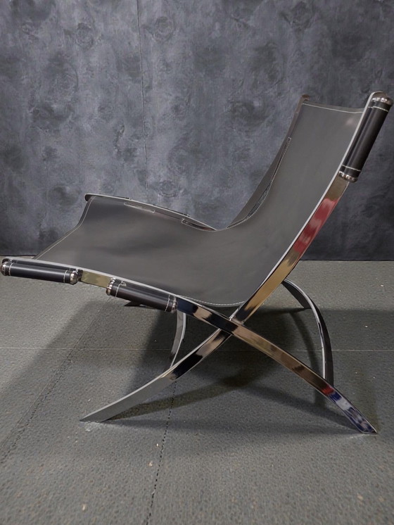 Il nuovo cuoio nero, tenuto in posizione da cilindri laterali, poggia su una struttura a X in acciaio cromato ed è eccezionalmente confortevole.