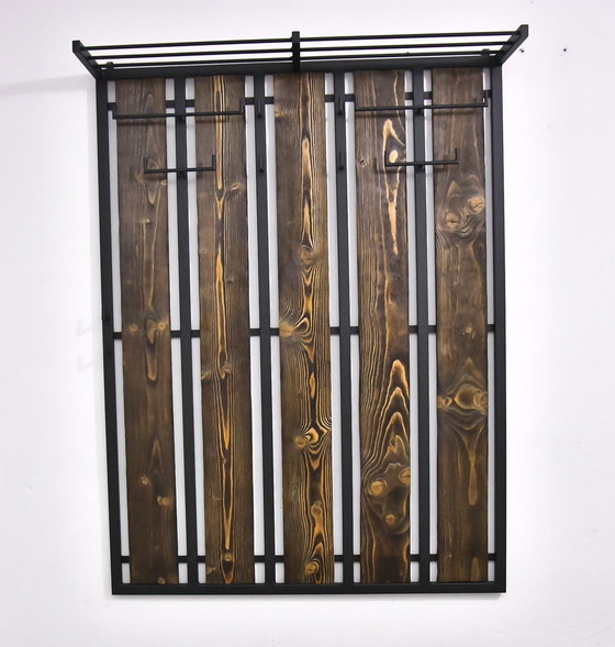 Appendiabiti da parete, guardaroba per corridoio, anticamera in stile loft, vintage. Appendiabiti fatto a mano dal design unico. Telaio in profilato d'acciaio 30 mm x 20 mm x 1,5 mm. Appendiabiti e ripiano portacappelli in tondino d'acciaio da 10 mm. Il tutto è verniciato in nero opaco. Tavole in abete satinato, tinte e poi verniciate. L'articolo è realizzato con attenzione ai dettagli, la costruzione solida lo rende un mobile per generazioni. Aggiungiamo un set di perni di montaggio all'appendiabiti. Appendiabiti in ottime condizioni, senza segni visibili di usura. **Dimensioni** Altezza: 150 cm Larghezza: 113 cm Profondità: 27,5 cm Peso: 29 kg