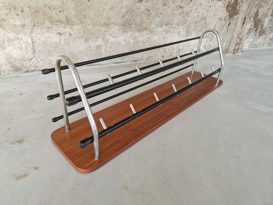 Questo appendiabiti da parete in stile olandese vintage è un'aggiunta elegante e funzionale a qualsiasi corridoio o ingresso. Realizzato in legno e metallo, offre una soluzione robusta e durevole per appendere cappotti e accessori. L'appendiabiti ha un aspetto classico con una base in legno marrone e aste in metallo color argento. Perfetto per gli amanti del design retrò e vintage.
