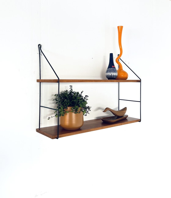 Appendiabiti da parete vintage degli anni '60. Due appendiabiti a forma di scala rivestiti in nero, facili da appendere con solo due viti. L'appendiabiti da parete ha due ripiani in teak che puoi posizionare all'interno dei ripiani. Un grazioso elemento d'arredo per esporre i tuoi oggetti preferiti. In ottime condizioni. Dimensioni: altezza 53 cm, profondità 21 cm, larghezza 75 cm.