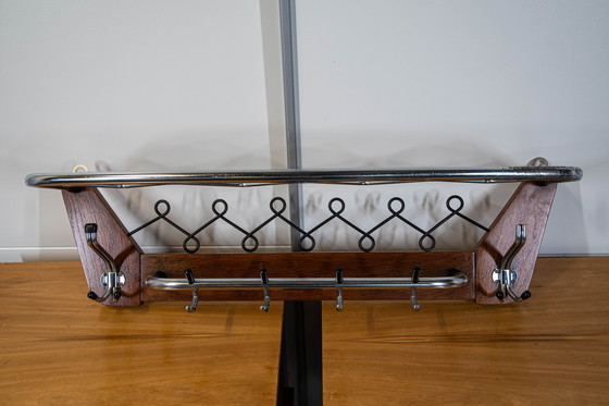 Bellissimo appendiabiti da parete vintage con schienale in teak massello e vimini nero. Un pezzo unico degli anni '60/'70 con finiture cromate lucide, il cui lato destro è meno lucido a causa dei segni di usura. Questo appendiabiti da parete di metà secolo offre numerose possibilità di riporre cappotti e grucce. Anche le stecche in metallo cromato, perfette per riporre cappelli, sciarpe o guanti, sono un elemento di spicco. In breve, un vero e proprio elemento di spicco nell'ingresso o nel corridoio di casa. Le foto mostrano chiaramente le buone condizioni e gli eventuali segni di usura. Dimensioni: Larghezza 75 cm; Altezza 20 cm; Profondità 20 cm.