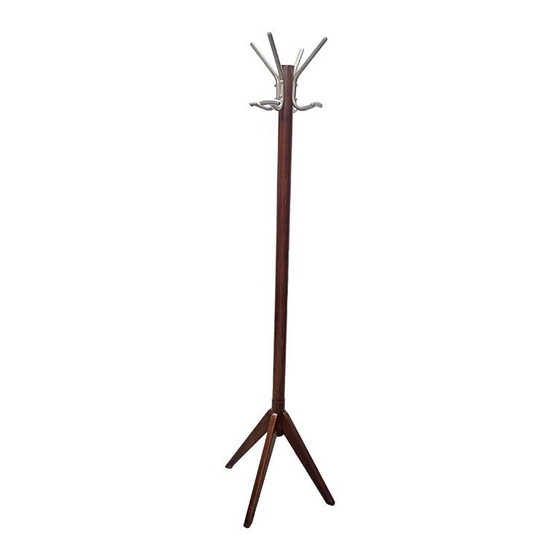 Appendiabiti da terra francese di metà secolo, risalente agli anni '50. Questo grazioso appendiabiti da terra è realizzato in legno di faggio e presenta ganci in alluminio per cappotti e cappelli. Ha uno stelo rotondo e poggia su quattro gambe. È in buone condizioni, robusto e presenta lievi segni di usura.