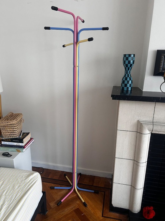 Appendiabiti IKEA 'Rig', disegnato da Tord Björklund nel 1987. Tubi metallici curvi, verniciati in colori pastello, con estremità in plastica nera. Usato, in buone condizioni, con qualche scrostatura di vernice sulle due barre superiori. Dimensioni in cm: altezza 169 cm, larghezza 54 cm, profondità 54 cm.