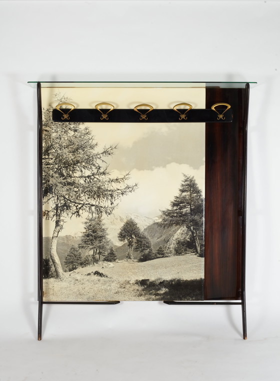 Questo splendido attaccapanni è stato realizzato in Italia negli anni '50. È realizzato in faggio, ottone, vetro e una foto di un panorama alpino stampata su MDF. Questo pezzo unico è in eccellenti condizioni originali, con lievi segni di usura.