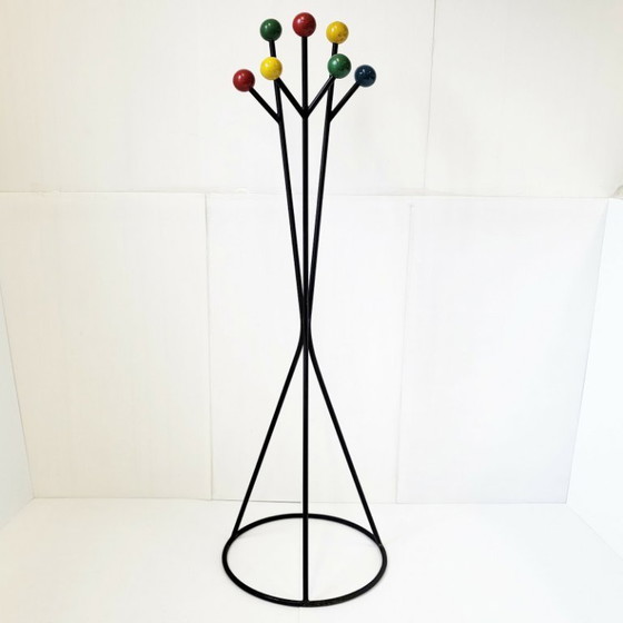 Buone condizioni generali. Normali segni di usura, in particolare sulla sfera gialla, leggera ossidazione del metallo, soprattutto alla base. Altezza 177 cm. Lunghezza 56 cm. Larghezza 56 cm. Un appendiabiti superbo e molto originale. Acquirenti internazionali benvenuti! Non esitate a contattarci per qualsiasi domanda. Grazie.