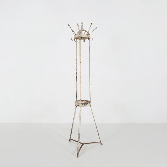 Francia / 1910 / attaccapanni / metallo / Art Déco / Art Nouveau Antico attaccapanni/attaccapanni Art Nouveau in metallo verniciato bianco con una patina molto bella. L'attaccapanni da terra altamente decorativo presenta una robusta struttura in metallo che garantisce stabilità offrendo al contempo ampio spazio per cappotti, cappelli e borse. Questo pezzo, con la sua perfetta combinazione di stile e utilità, è una scultura da corridoio unica e pratica. Dimensioni: Altezza: 200 cm Diametro base: 60 cm Diametro parte superiore: 40 cm