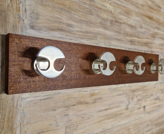 Realizzato in rovere massello con pomelli in alluminio, ciascuno in grado di contenere almeno tre cappotti.