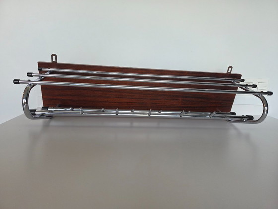 Appendiabiti vintage in tubolare cromato e impiallacciato in teak di 80 x 20 cm, con 11 ganci.