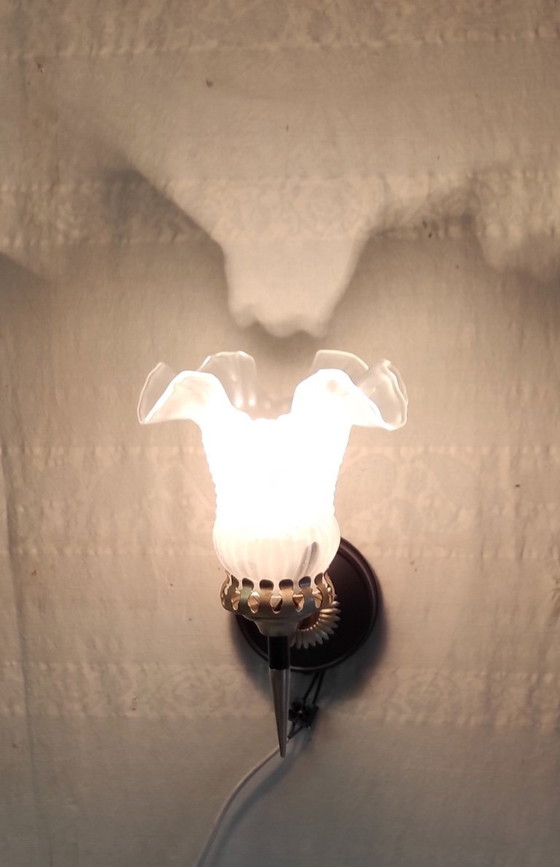 Davvero vintage! Applique in stile Art Déco con montatura in ottone dorato/nero e paralume in vetro a forma di tulipano. Attacco E14, cavo standard.