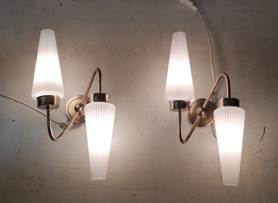 So Déco! Coppia di applique asimmetriche a due luci in ottone con paralumi in vetro opalino.