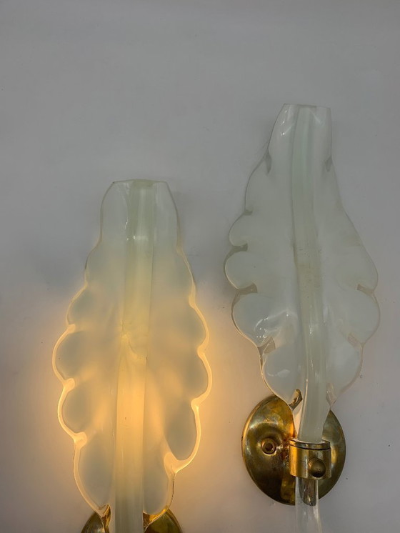 Coppia simile di applique da parete realizzate in vetro soffiato lattimo dalla forma stilizzata a foglia, caratterizzate da linee morbide e bordi ondulati che richiamano un motivo naturale ed elegante; il vetro, leggermente traslucido, diffonde la luce in modo delicato e uniforme creando un’atmosfera calda e raffinata, mentre le armature in ottone conferiscono un piacevole contrasto cromatico e un gusto vintage, rendendo queste lampade adatte ad ambienti classici o moderni con richiami déco e mid-century, ideali per soggiorni, corridoi o camere da letto.
