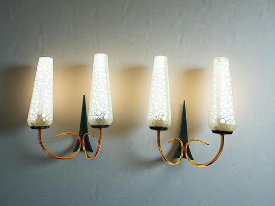 Applique da parete in ottone Mid-Centur Modern con paralumi conici in vetro smerigliato, anni '50, set di 2