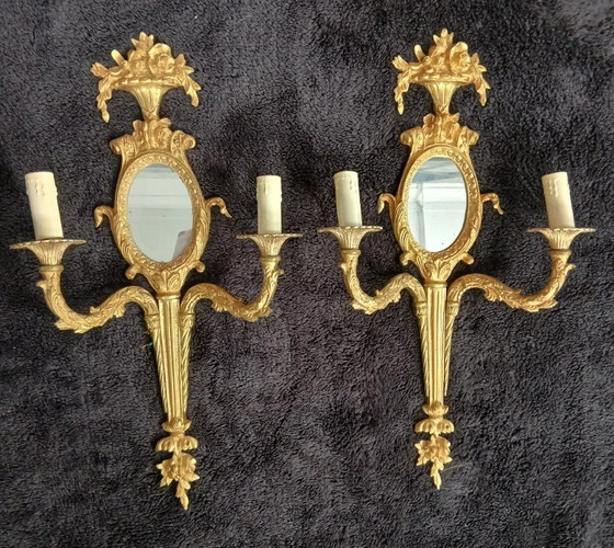 Queste applique in bronzo dorato, impreziosite da delicati specchi, incarnano l'eleganza senza tempo del classicismo. La finitura dorata e i dettagli finemente scolpiti aggiungono un tocco di raffinatezza a qualsiasi interno.