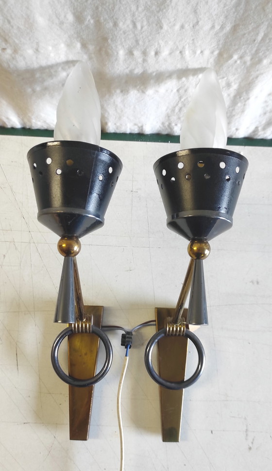 Provenienti da un magazzino degli anni '50. Coppia di applique Lunel in bronzo lucido e verniciato, con anello. Paralumi rodoidi traforati. Lampadine originali XL a fiamma ritorta (Croze) incluse. Integre e originali. Ricablate di recente secondo gli standard attuali.
