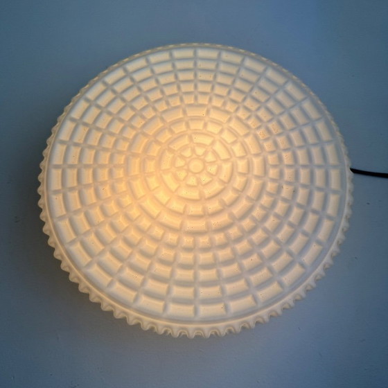 Rara e splendida applique rotonda di grandi dimensioni in vetro opalino a nido d'ape. Può essere utilizzata anche come plafoniera. Anni '60. Base in metallo zincato. Lampada molto bella. Si notano alcune micromacchie (vedi foto).