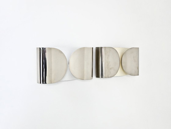 Coppia di applique in metallo cromato disegnate da Afra e Tobia Scarpa. Modello: Foglio. Usura dovuta al tempo e all'età delle applique.