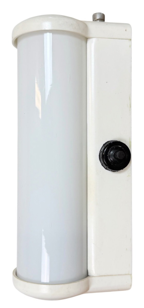 Lampada da parete vintage industriale in bachelite bianca, prodotta da Elektrosvit nell'ex Cecoslovacchia negli anni '50. Presenta un corpo in bachelite con interruttore originale e una copertura in vetro opalino. Il portalampada richiede lampadine standard E14. Peso della lampada: 0,2 kg.