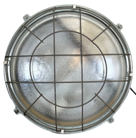 Questa lampada da parete in alluminio pressofuso grigio è stata prodotta da Elektrosvit nell'ex Cecoslovacchia negli anni '80. Presenta un corpo in alluminio pressofuso, una copertura in vetro curvato satinato e una griglia in ferro. Due portalampada in porcellana richiedono lampadine E 27. Può essere utilizzata anche come lampada da soffitto. Il peso della lampada è di 6,5 kg.