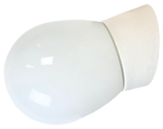 Lampada industriale vintage realizzata nell'ex Cecoslovacchia negli anni '70. Presenta un attacco a parete in porcellana bianca e una copertura in vetro opalino. Il portalampada richiede lampadine standard E27/E26. Cavo nuovo. Il peso della lampada è di 1 kg.