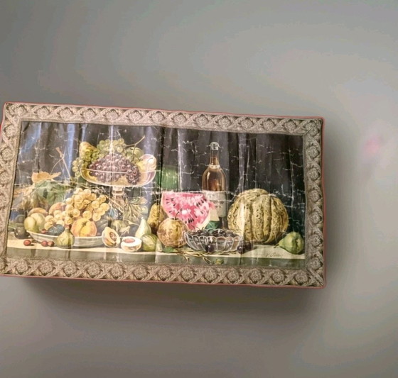 Questo arazzo da parete degli anni '40 è un autentico pezzo vintage che aggiungerà un tocco di eleganza e storia al vostro spazio. Raffigurante una natura morta con frutta e bottiglia, l'arazzo è un esempio di artigianato dell'epoca, caratterizzato da dettagli intricati e colori ricchi che, nonostante il passare del tempo, mantengono il loro fascino.