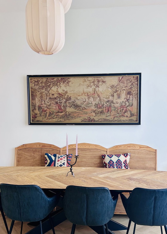 Bellissimo arazzo vintage di grandi dimensioni con motivo classico (stile vittoriano). Questo pezzo eccezionale aggiunge immediatamente calore, carattere e un tocco di lusso ai vostri interni. L'arazzo è incorniciato professionalmente in una semplice cornice scura, che gli conferisce un'atmosfera moderna e raffinata, valorizzandone l'intera opera.