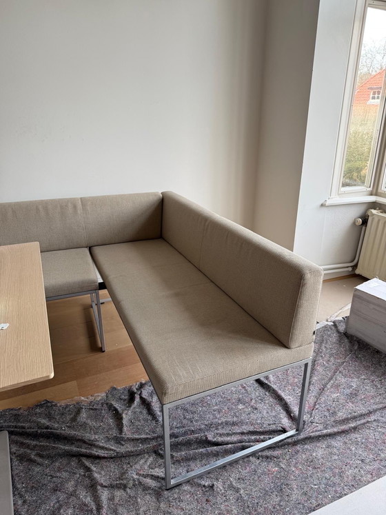 Arredate la vostra zona pranzo con la panca Arco Frame e le sue due sedie abbinate, una perfetta fusione di design moderno e funzionalità. Questo set presenta un'estetica elegante e minimalista con il suo rivestimento in tessuto beige e la robusta struttura in metallo, offrendo comfort e stile.