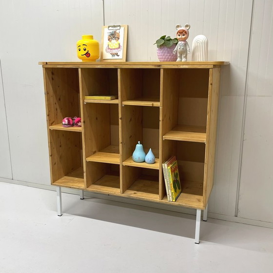 Armadio scolastico/divisorio/libreria vintage. È realizzato in legno di pino, ha diversi scomparti e poggia su gambe di metallo. Ha un piano supplementare con angoli arrotondati. Abbiamo completamente pulito e rifinito l'armadio quando è arrivato e il pannello posteriore è stato rinnovato. Si regge saldamente sulle gambe e presenta i normali segni d'uso che si addicono a un armadio scolastico d'epoca.