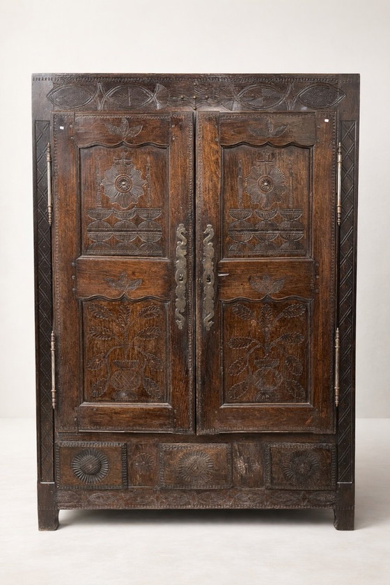 Armadio antico in legno massello, riccamente intagliato, con ante decorate con motivi floreali e simbolici. Splendida patina d'epoca e dettagli artigianali, che gli conferiscono notevole fascino e carattere. Ideale per un arredamento autentico o rustico. Buone condizioni generali.