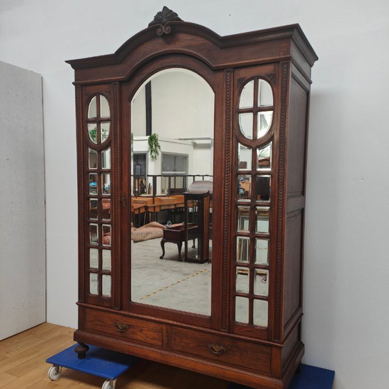 Porta il fascino di un tempo nella tua camera da letto con questo splendido armadio antico. Questo robusto armadio a muro, realizzato in rovere scuro, emana il raffinato stile dei primi del '900. Gli specchi catturano immediatamente lo sguardo. Lo specchio centrale semicircolare con bordo smussato è un'ampia anta con serratura funzionante. A sinistra e a destra si trovano due pannelli con vetri smussati disposti in un elegante motivo a rombi. Ammira la maestria artigianale delle raffinate sculture in legno e l'elegante ornamento a volute nella parte superiore. Gli autentici segni del tempo raccontano una storia e conferiscono al mobile il suo carattere vintage unico. Nella parte inferiore, due ampi cassetti con guide classiche offrono ulteriore spazio per riporre gli oggetti. Dietro l'ampia anta si trova un'asta appendiabiti che si estende per tutta la larghezza dell'armadio. Questo elemento di spicco si integra perfettamente in un interno in stile country o funge da audace contrasto in una casa moderna. Un'aggiunta senza tempo! Data la sua età, gli specchi potrebbero presentare alcune macchie dovute agli agenti atmosferici. Inoltre, l'armadio presenta alcuni lievi segni d'uso, coerenti con la sua età. Questo armadio è completamente smontabile e facile da rimontare. SE SI SCEGLIE LA SPEDIZIONE, IL MOBILE VERRÀ CONSEGNATO SMONTATO.
