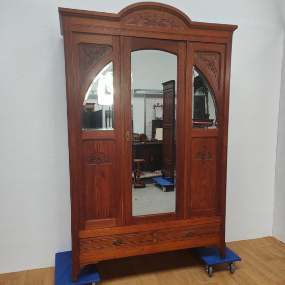 Siete alla ricerca di un pezzo unico e di grande impatto? Questo splendido armadio antico in rovere emana pura eleganza. I raffinati dettagli Art Nouveau risaltano immediatamente. Ammirate le intagliature a mano con graziosi motivi floreali e i caratteristici specchi ad arco. Il caldo e robusto legno di rovere presenta una venatura straordinaria. Lievi segni di usura conferiscono a questo mobile il suo autentico carattere vintage. Grazie ai due comodi cassetti e all'ampio spazio per appendere gli abiti, questo armadio unisce bellezza e funzionalità. L'armadio è dotato di un'ampia anta con serratura e chiave funzionanti. Collocate questo pezzo di grande effetto in una camera da letto moderna per un caldo contrasto. È garantito che catturerà l'attenzione anche come elegante armadio in un ampio corridoio. Portate un pezzo di storia nella vostra casa all'istante con questo autentico mobile! Data la sua età, gli specchi potrebbero presentare alcune macchie dovute agli agenti atmosferici. Inoltre, l'armadio presenta alcuni lievi segni d'uso, commisurati alla sua età.