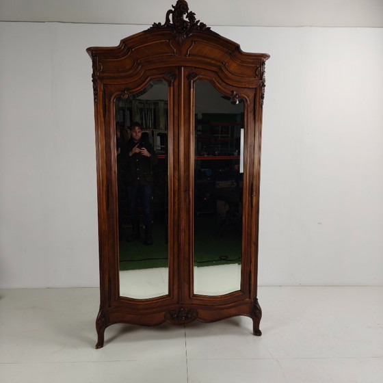 Elegante armadio francese in stile Luigi XV in legno intagliato, con due ante a specchio.
