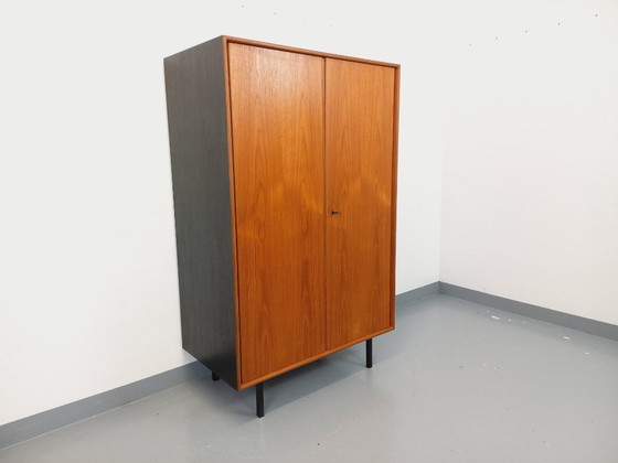 Armadio vintage in stile modernista scandinavo degli anni '60, marchiato "RT Mobel", in teak, con lati e piano in legno nero, gambe tubolari quadrate in metallo nero, ampio spazio di archiviazione: 2 ante con asta appendiabiti e ripiano, 1 chiave, ottime condizioni generali.