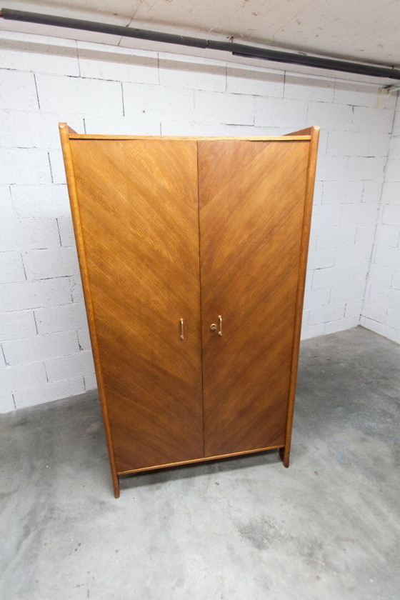 Armoire des années 1950, Mid-Century Modern, en plaquage de chêne utilisant la technique du frisage typique des années 1930 à 1950. Elle combine un design fonctionnel avec une esthétique géométrique typique de l'époque.