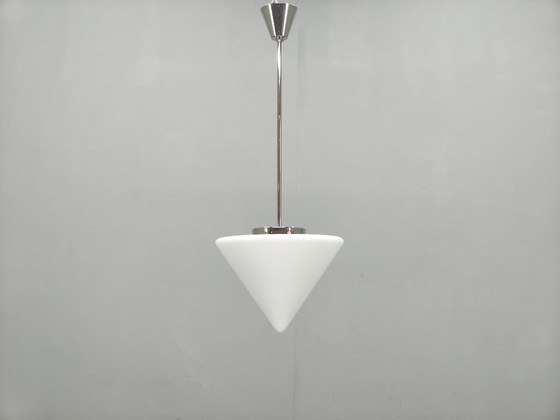 A refined Art Deco style pendant light produced in Czechoslovakia during the 1970s. This piece features a sleek chrome-plated structure combined with a beautifully shaped milky glass shade in a clean conical form.