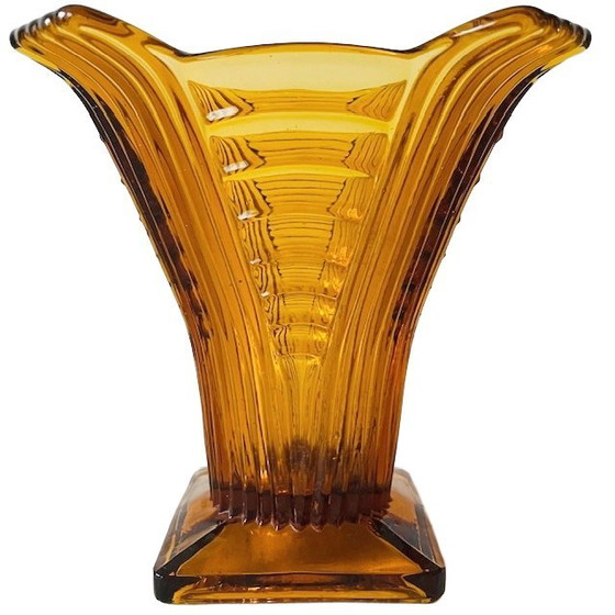 Questo splendido vaso Art Déco in ambra è stato realizzato da Stölzle Hermanova Hut negli anni '30. Il vaso è marchiato "Tchecoslovaquie" sul fondo.