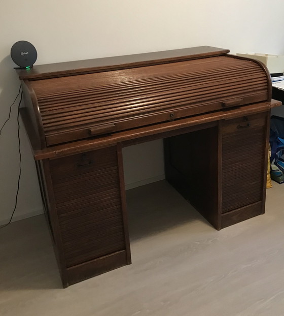 Scrivania cilindrica in rovere massello di alta qualità con 8 ampi cassetti. Le ante a rullo e la copertura a rullo mantengono il vostro spazio di lavoro in ordine e si chiudono con chiavi originali e raccordi in ottone. Anche i vani sopra il piano di lavoro offrono ampio spazio di archiviazione. Comodi ripiani estraibili si trovano sui lati, perfetti per un laptop, ecc. La scrivania può essere smontata e rimontata facilmente, rendendola facile da trasportare. Il piano di lavoro (estraibile) in truciolato non è trattato, ma può essere verniciato o rivestito. La scrivania può essere trattata con un lucido per mobili in rovere scuro per prevenire lo scolorimento. A causa di un trasloco, non c'è più spazio per questa scrivania. Questa scrivania fatta a mano, risalente ai primi del '900, è esente da marciume del legno e tarli e durerà sicuramente altri 100 anni. Una scrivania realizzata in questo modo è diventata inestimabile e unica.