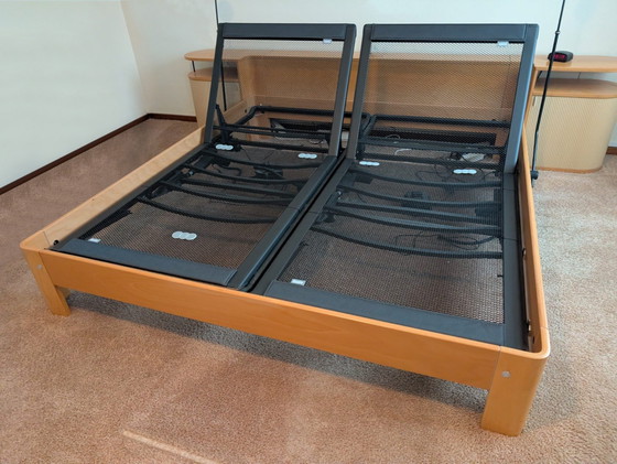 Il letto è dotato delle più recenti molle Auping, regolabili elettricamente sia nella zona della testata che in quella dei piedi. È inoltre dotato di uno schienale e di luci notturne Auping abbinate. Questa combinazione rende il letto molto pratico per riporre i propri effetti personali e, ad esempio, per leggere.