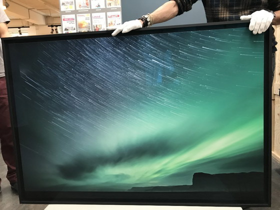 Aurora boreale e scie stellari in Islanda, 100x150cm, cornice museale, edizione 1/3