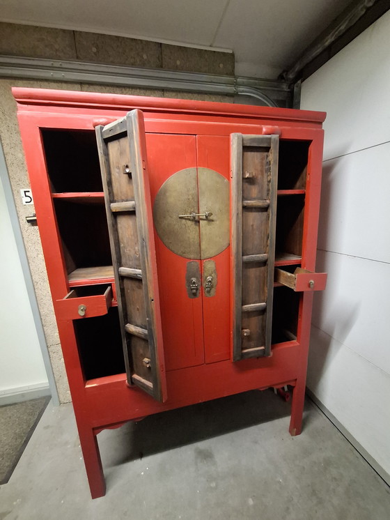 Questo autentico armadio nuziale cinese è uno splendido esempio di artigianato tradizionale ed estetica orientale. Con il suo sorprendente colore rosso e le eleganti finiture in metallo, questo armadio non è solo funzionale, ma anche un vero e proprio elemento di spicco in qualsiasi ambiente. L'armadio è dotato di due ante larghe e due strette, che offrono un ampio spazio contenitivo con un ripiano a tutta larghezza e quattro comodi cassetti. Ideale per riporre abiti, biancheria o altri oggetti personali. L'armadio emana un fascino senza tempo e aggiunge un tocco di esotica eleganza al vostro spazio abitativo. Contattateci per maggiori informazioni o per aggiungere questo armadio unico alla vostra collezione.