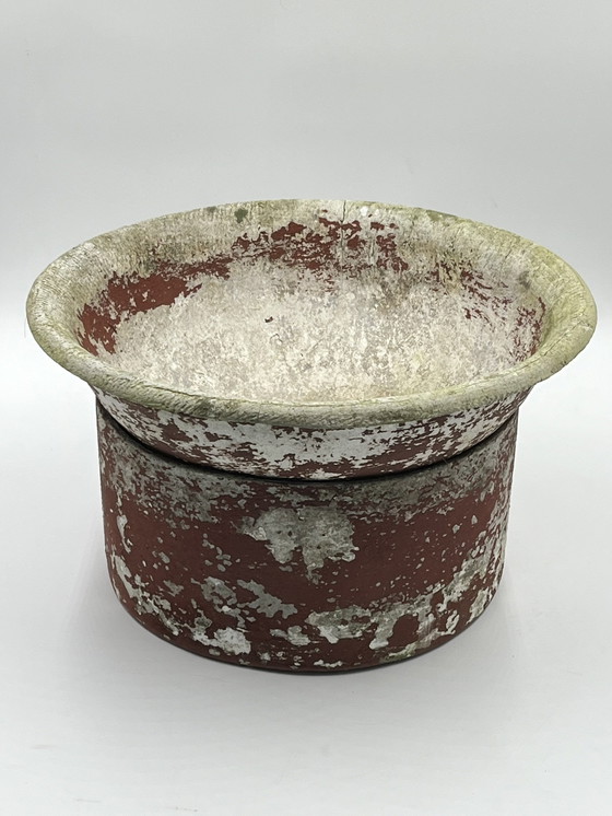 Bacinella e il suo supporto che può essere utilizzato anche come vaso. 2 in 1 a scelta. Bellissima patina sul cemento. Dimensioni: Base: 30x15 cm. Bacinella: 40x13 cm.