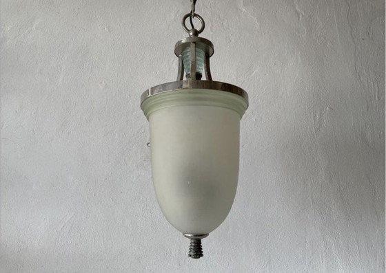 Eccezionale lampada da soffitto Art Déco in vetro verde e marmo con base cromata, in stile Mid-Century, anni '40, Italia. Il paralume è in ottime condizioni vintage. Questa lampada utilizza 3 lampadine E14.