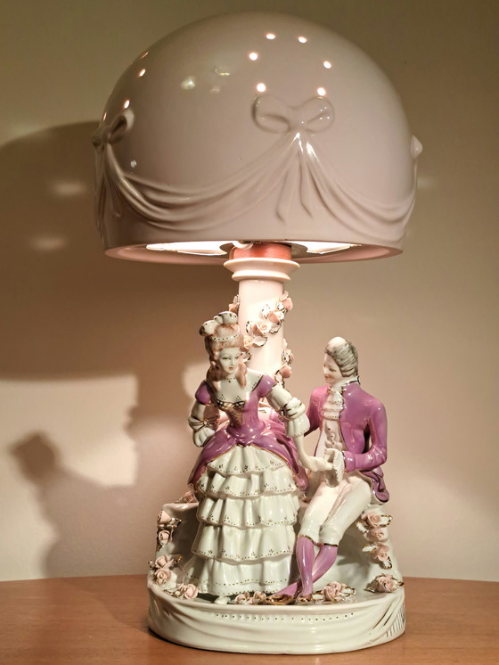 Features a charming Rococo couple, finely detailed and hand-painted with delicate porcelain flowers and gold accents.