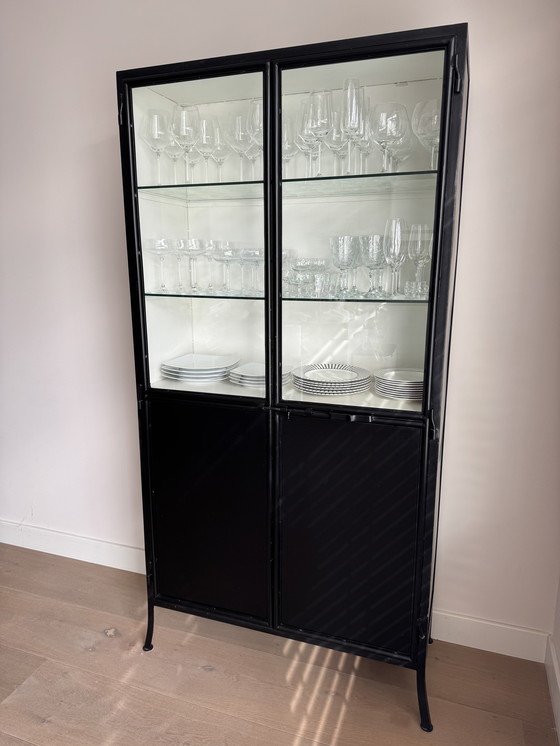 Questa splendida vetrinetta in metallo nero è un'elegante aggiunta a qualsiasi interno. Con ante e ripiani in vetro, offre un modo elegante per esporre le stoviglie o gli oggetti decorativi. Il mobile ha un design moderno con un'elegante struttura in metallo nero e pannelli in vetro trasparente. Perfetto per organizzare ed esporre i pezzi più belli.