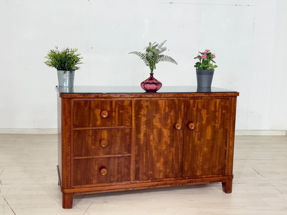 In vendita una splendida cassettiera vintage, caratterizzata dalle venature del legno eccezionali e vivaci. La calda impiallacciatura in vero legno, probabilmente in elegante betulla fiammata o noce, conferisce un'atmosfera elegante e accogliente a qualsiasi ambiente. Il mobile è in ottime condizioni vintage e offre ampio spazio contenitivo grazie a tre ampi cassetti e un ampio mobiletto con doppie ante. Un dettaglio speciale è il piano in vetro rimovibile, che non solo protegge la superficie in legno, ma conferisce anche alla credenza una finitura di alta qualità.