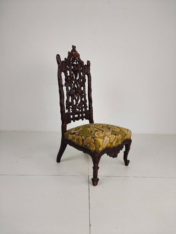 Questa è una poltrona in stile Foresta Nera del XIX secolo, splendidamente realizzata, riccamente intagliata con motivi a vite e foglie. È attribuita al prestigioso ebanista olandese Horrix, attivo a L'Aia intorno al 1870.
