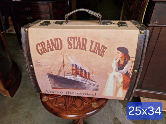 Questa affascinante valigia vintage offre un nostalgico viaggio indietro nel tempo con il suo splendido design Grand Star Line. Perfetta come elemento decorativo, aggiunge un tocco di eleganza classica a qualsiasi ambiente.