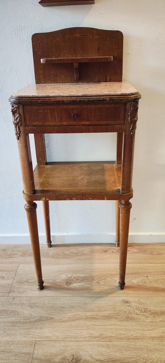 Il comodino è un antico mobile francese in rovere, probabilmente risalente agli anni '20, con uno stile che ricorda Luigi XVI o Art Nouveau/Art Déco.